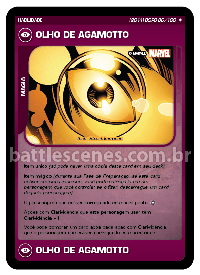 A carta apresentada no hotsite do Battle Scenes nesta prévia é a carta de habilidade que possui toda uma regra peculiar, o Olho de Agamotto. Primeiramente ele é um item único (só pode haver uma cópia dela no baralho), fora que ela é um item mágico de várias utilidades, ou seja uma carta indispensável a qualquer deck, principalmente se você tiver o Doutor Estranho ou qualquer outro personagem que use magia ou clarividência.