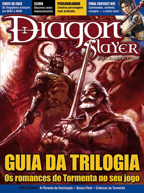 isolacionista. Há divisões entre adeptos de um ou outro sistema, um ou outro cenário… Os eventos nos reúnem, mostram que no fundo somos todos fãs do mesmo jogo, com muito mais semelhanças do que diferenças. Todos conhecemos a alegria de derrotar o lorde maligno de trocentésimo nível quando só nos restava 1 ponto de vida, todos já jogamos um dado pela janela após a quinta falha crítica seguida. Editoras como a Jambô, Secular, Red Box e Retropunk apoiam-se mutuamente — em nome do RPG. Iniciativas mais tradicionais ou independentes, para o grande público ou voltadas a um nicho. É motivo de sobra para se orgulhar! De Tormenta e do RPG como um todo.Esta edição da DragonSlayer traz material para os principais sistemas do Brasil, para não deixar nenhum companheiro RPGista de fora! Temos um preview especial do Guia da Trilogia, com novas classes de prestígio e as fichas de sir Orion Drake, Ingram Brassbones e Trebane; os Vingadores para Mutantes & Malfeitores e 3D&T; o sistema de combate de Final Fantasy XIII para 3D&T; a conclusão da HQ General Invencível, e as colunas e seções de sempre.