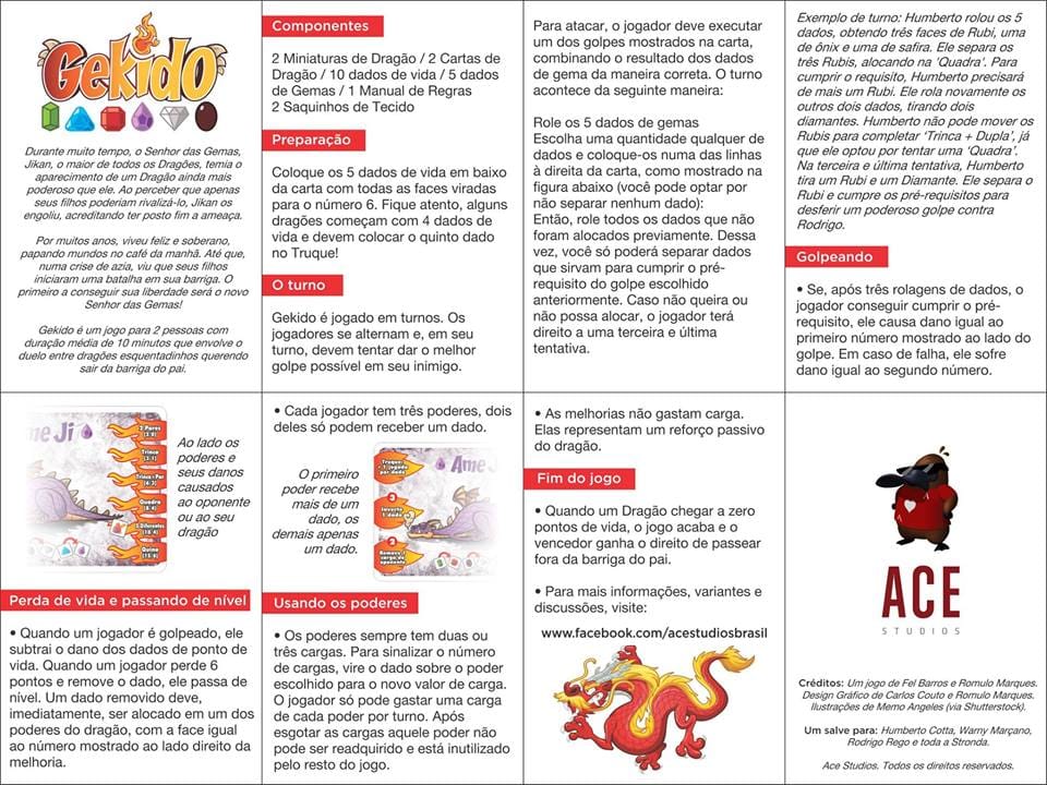 No Gekido os dragões se confrontam utilizando dados. O jogo possui regras bem simples e geniais que são super fáceis de aprender. É o tipo de jogo que dá para ser jogado em família ou com os seus filhos pequenos, o que é excelente para quem é pai ou mãe e quer introduzir os pequenos nos jogos de dados e tabuleiro. A Ace Studios divulgou ontem em sua página no Facebook as regras do jogo, que você pode conferir logo abaixo (clique na imagem para amplia-la).